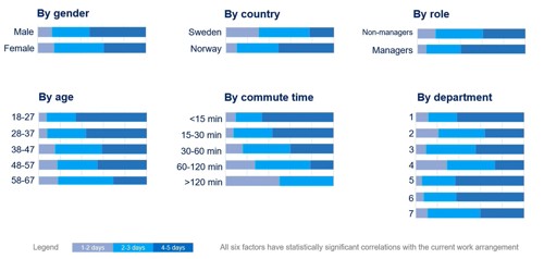 Blant funnene var at de som er ledere er mye mer på kontoret enn ikke-ledere. I tillegg er de over 58 år sjeldnest på kontoret, og nordmenn tar turen oftere enn svensker.