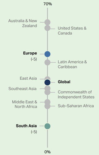 Et slående faktum med Gallup-undersøkelsen er hvor dårlig Europa svarer på dette med engasjement på jobb. Ingen av ti områder Gallup har delt verden inn i kommer ut med lavere prosent engasjerte enn Europas 14%. Topper gjør USA/Canada og Asias sørlige og sørøstlige deler med 24 til 33 prosent engasjerte. De fleste land i Europa, deriblant Norge er imidlertid rundt 20 prosent. Verdensdelen trekkes ned av svært få engasjerte i de folkerike landene Storbritannia og Spania (begge 9%), Frankrike (6%) og Italia (4%). Tallene måles som snitt over tre år, og var dårlige allerede før pandemien.