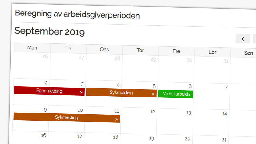 Kalkulatoren består av en kalendervisning, hvor du drar elementer som egenmelding, sykmelding og første fraværsdag inn på riktige dager.