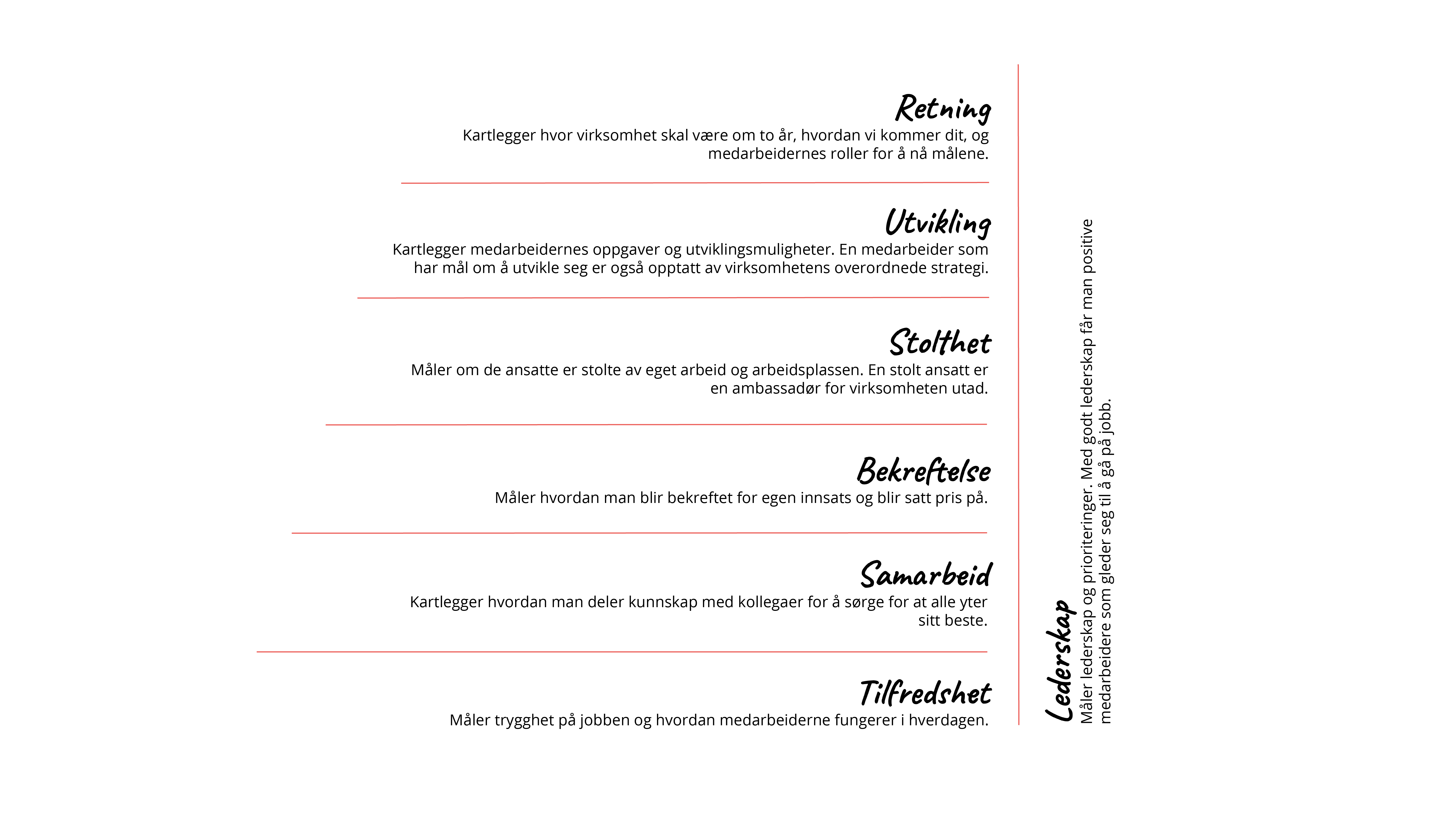 Som du sikkert har lagt merke til finnes det en tydelig rød tråd i eksemplene vi bruker. Slik ser det også ut i forskningen for øvrig. Da vi satte oss sammen med erfarne HR-eksperter for å oppsummere forskningsrapporter og studier av høy troverdigheter ble det naturlig å konkludere som vi har gjort. Dere kan være trygge på at vår modell fanger alle aspekter som er relevante for økt engasjement på jobben.