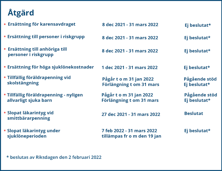 Vissa åtgärder är alltså fortfarande förslag och ingår i den extra ändringsbudget som regeringen har presenterat. Åtgärderna kommer att beslutas i riksdagen den 2 februari 2022 och kommer då att gälla retroaktiv.
